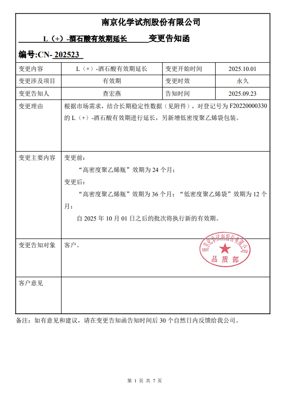 根據(jù)市場需求,對登記號為F20220000330的 L(+)-酒石酸有效期進行延長,另新增低密度聚乙烯袋包裝。
